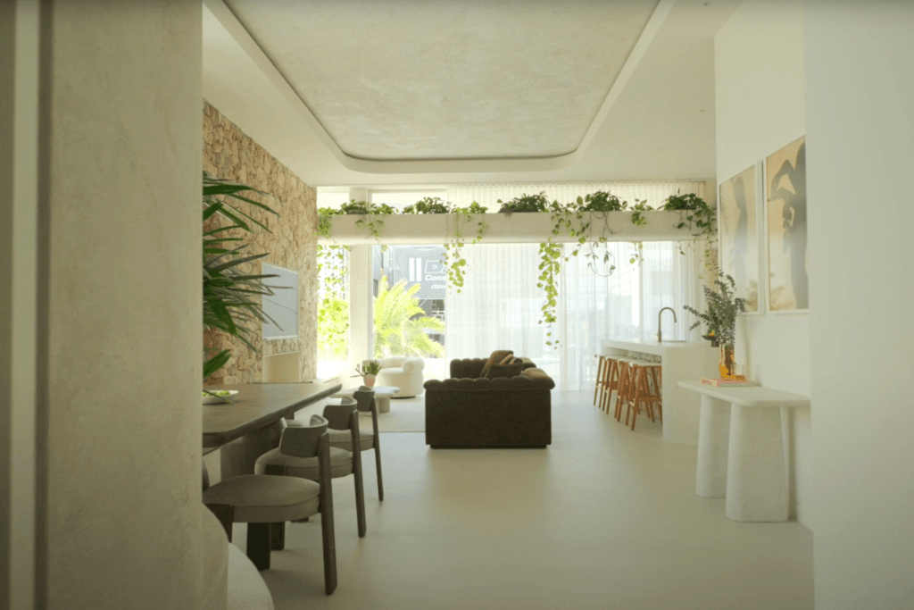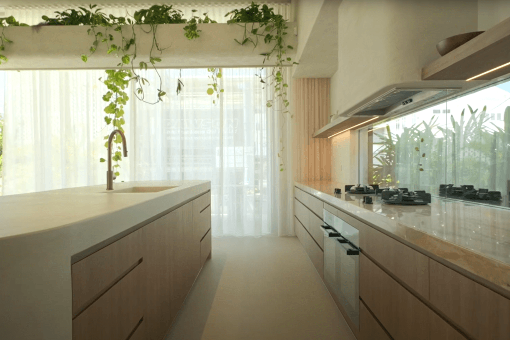 The gourmet kitchen and living areas incorporate the same use of a calm and perfect beachside colour palette. The combined space increases your sense of being part of something natural with its timber battens, use of natural stone and marble for vanities and bench tops, plus the inclusion of lush green planters throughout.