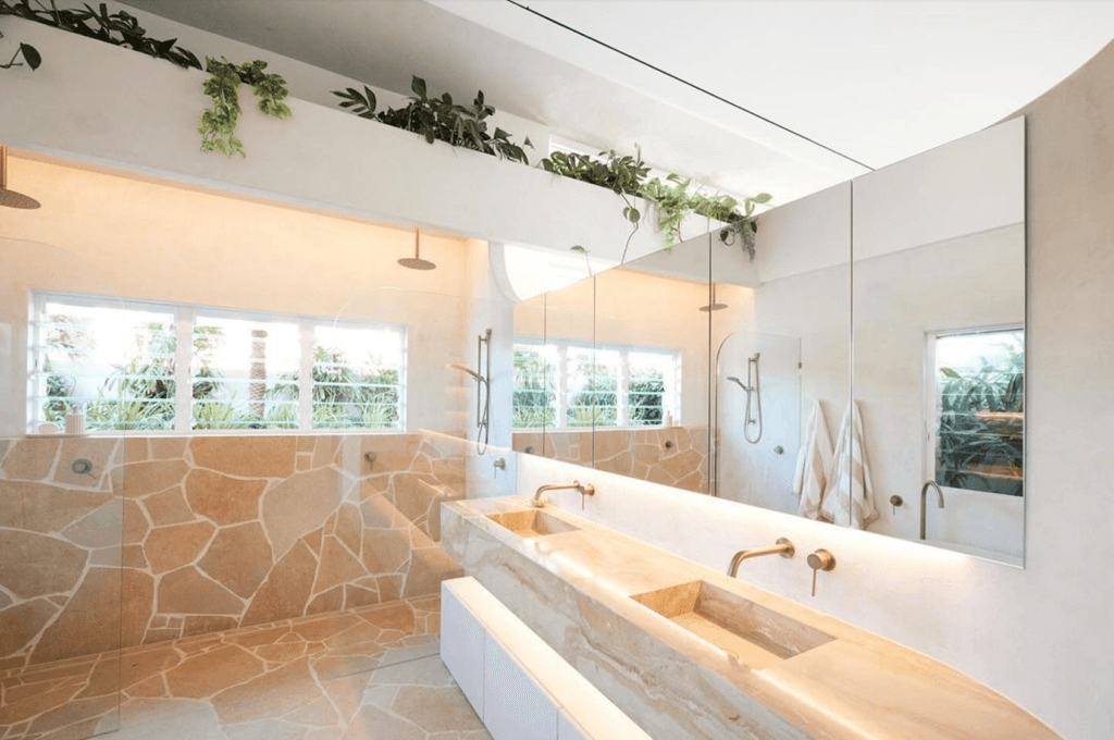 The bathroom was awarded the HIA Gold Coast/Northern Rivers Bathroom of the Year, and it’s easy to see why. With its luxurious marbled double vanity, travertine flooring, striking featured walls in the shower, smart hidden storage solutions, frosted glass, and hidden power points, it evokes the feel of a high-end spa resort.