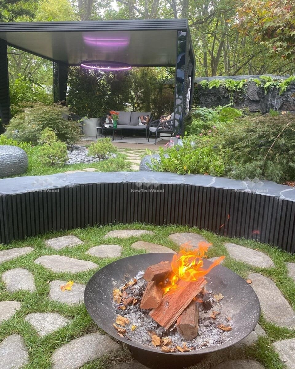 The traditional rice paper wall with a black shingle roof was a nod to the Japanese style. One of the main aspects of the design was the use of Black on Black, which was achieved as a huge success using NewTechWood Castellation cladding wrapping the columns of the outdoor room and fire pit area. The dark tones created drama and mood in the garden.