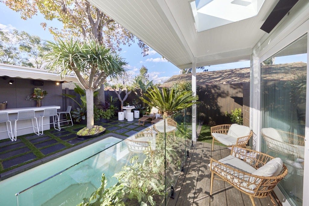 The reveal was amazing and the couple’s dream of a tropical oasis in Brighton became a reality.  Mitch and Mark maximise the indoor-outdoor flow, with the open-plan space that had been enclosed by the pool surround fencing, including the poolside cabana complete with the second kitchen (fridge, BBQ and alfresco dining area).