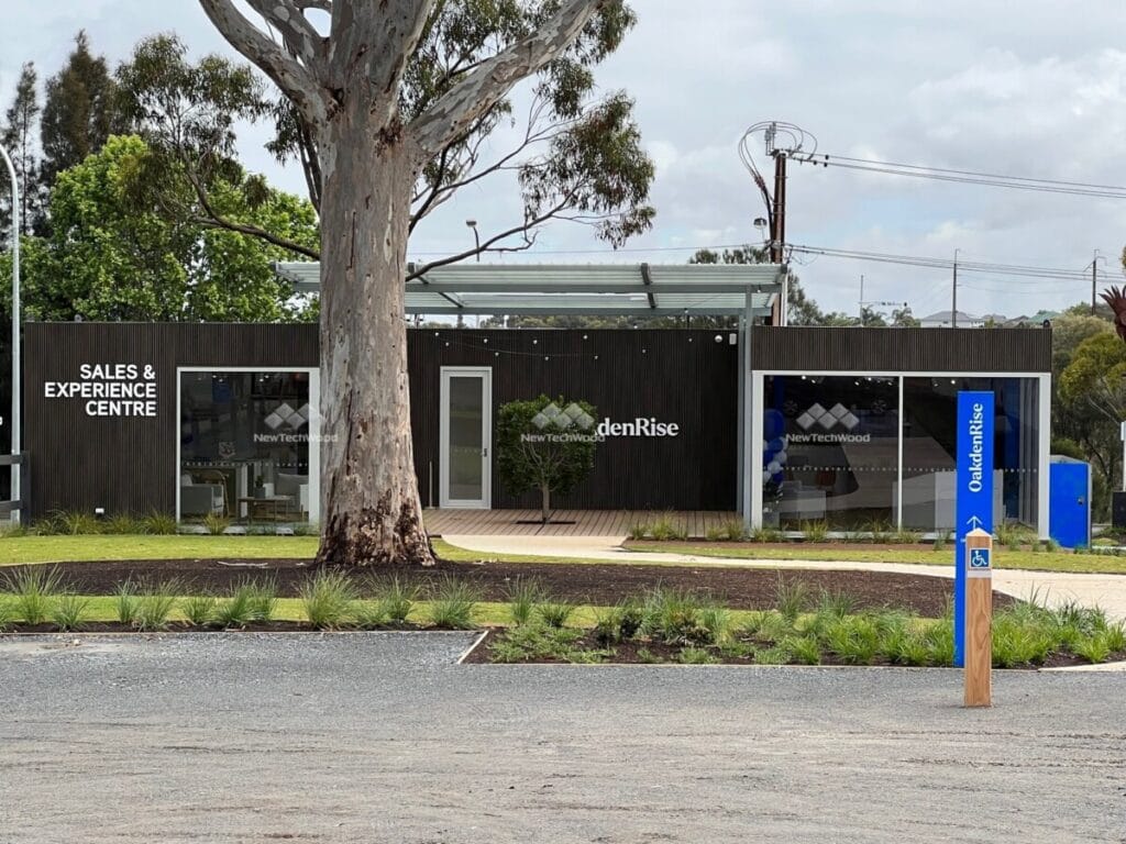 And welcoming homebuyers and builders is the Sales & Experience Centre, easily identifiable by the large signage and the NewTechWood UH61 Castellation Cladding in colour ‘Aged Wood’ adorning the exterior walls.