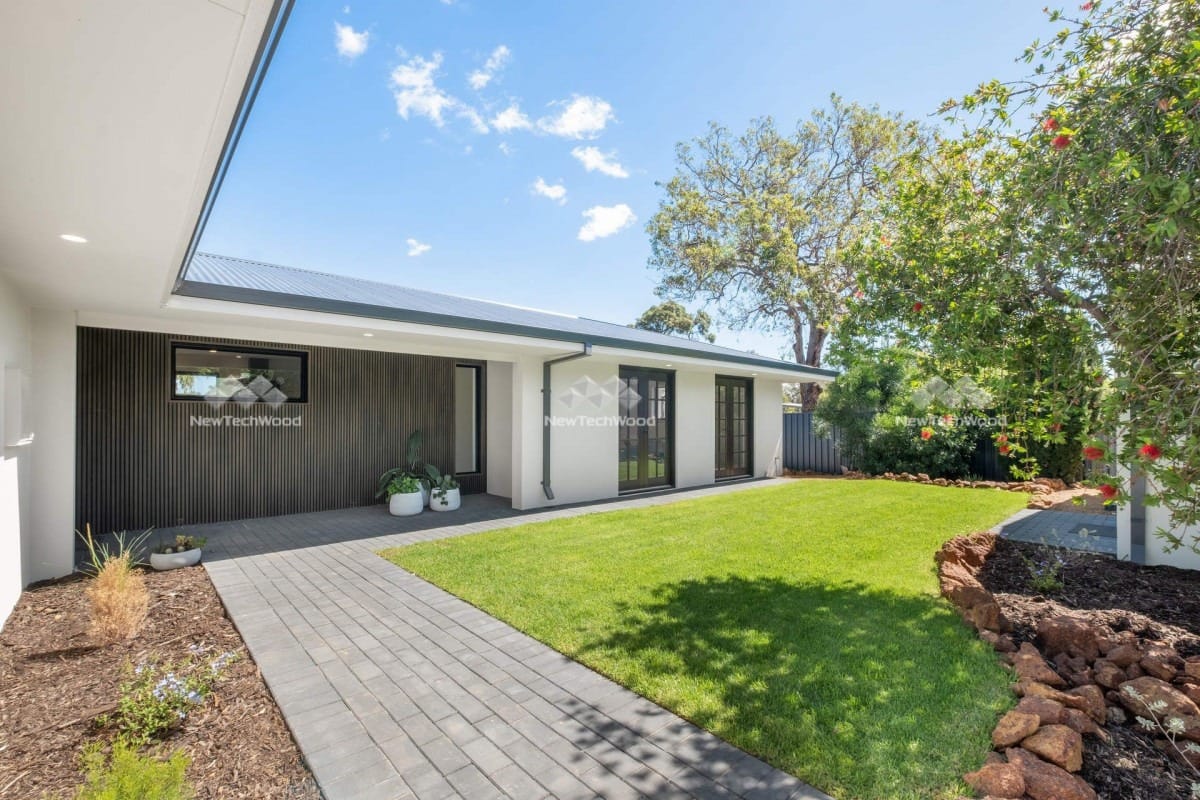 Among other things, like a new kitchen, the renovation included a new colour bond roof, new windows and joinery, new fixtures and fittings and new reverse cycle ducted air-conditioning. And the simple removal of this outdated arched verandah entrance and the addition of NewTechWood UH61 Castellation Cladding (colour Aged Wood) helped transform this external part of the home and bring it into the 2020s.